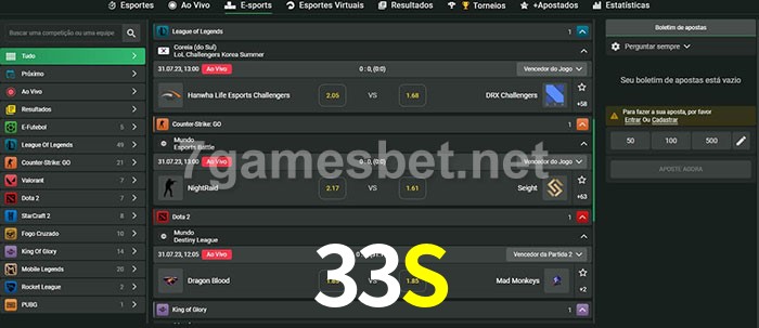 O 33S oferece uma grande seleção de opções de apostas em e-sports com probabilidades competitivas